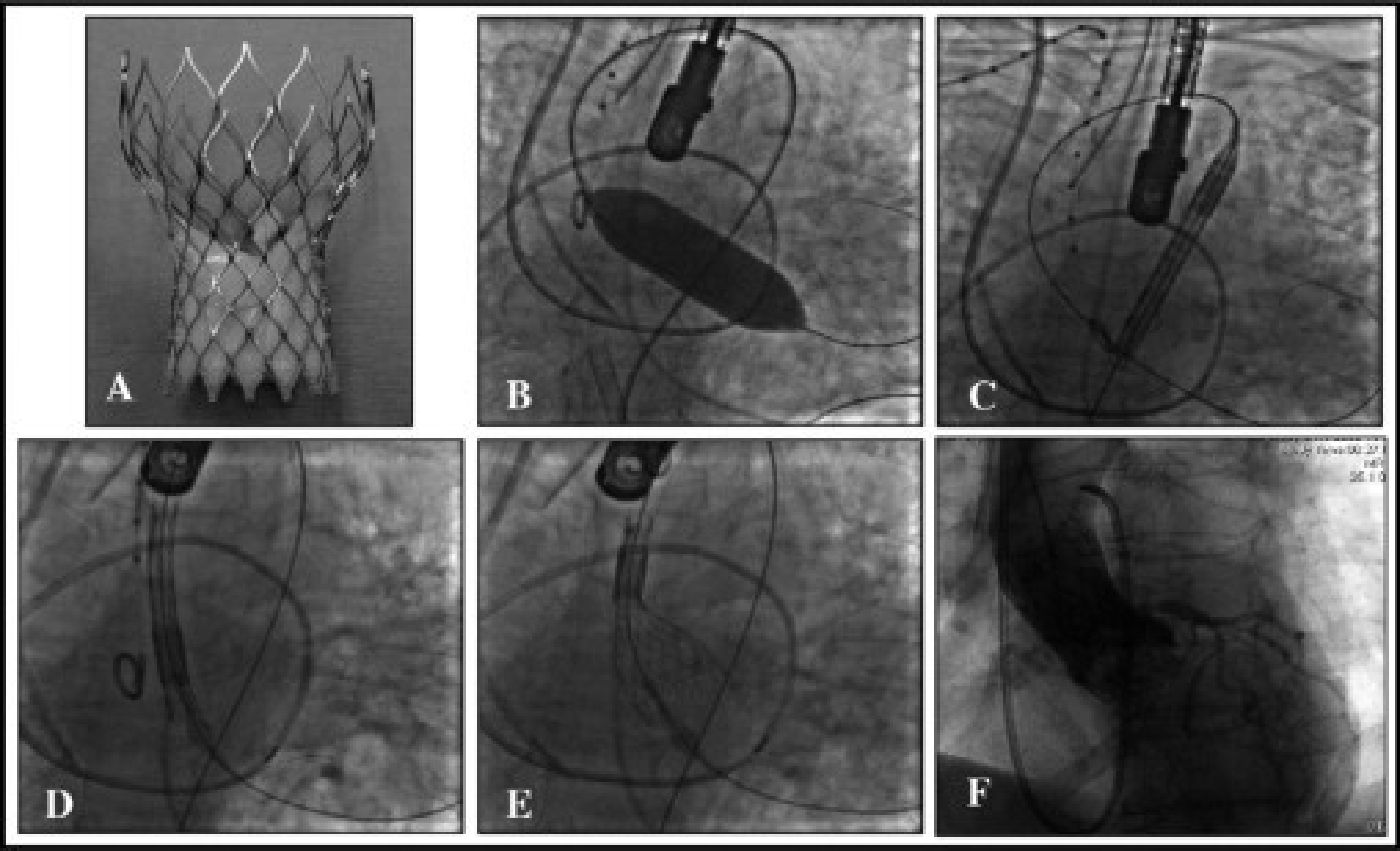 C&D) Passing the Core Valve from the aorta across the aortic valve;